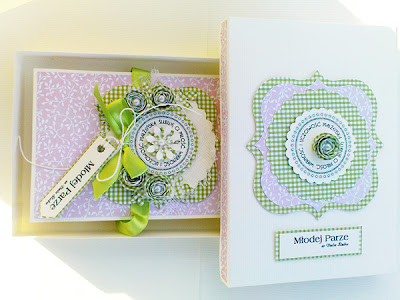 Moja karteczka jest w klimacie ślubnym, nie mam tych wszystkich pięknych wykrojników ale i tak chyba wyszła nieźle:) Wszystko wycinane ręcznie. Do karteczki dorobiłam pudełeczko w podobnym klimacie kolorystycznym. Powstał komplet - kartka w pudełku.