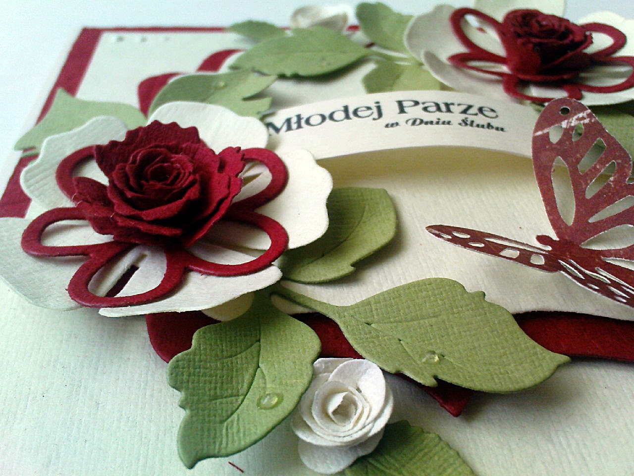Karteczka imieninowa z różyczkami z czerwonego papieru czerpanego, listki magnoliowe z zielonego papieru czerpanego, który świetnie się wycina, ma super fakturę i jest stosunkowo miękki, dzięki czemu można go do woli formować.