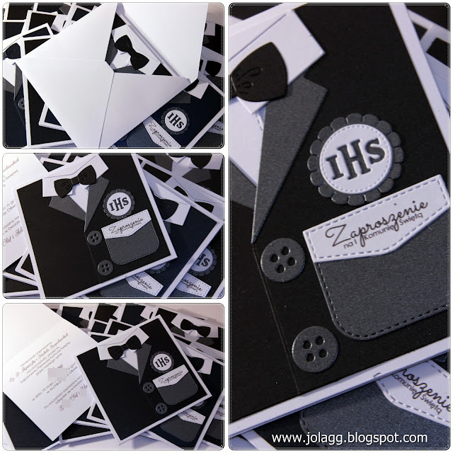 Zaproszenia w eleganckim garniturze na I Komunię Świętą na wspaniałych bazach Rzeczy z Papieru.